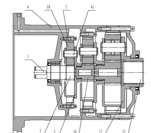 在工作時(shí), 電機(jī)通過(guò)聯(lián)軸與減速機(jī)輸入裝置 1 相連,驅(qū)動(dòng)第一級(jí)太陽(yáng)輪 7,太陽(yáng)輪驅(qū)動(dòng)第一級(jí)行星輪 20,帶動(dòng)第一級(jí)行星架 3 繞太陽(yáng)輪軸線轉(zhuǎn)動(dòng),從而驅(qū)動(dòng)第二級(jí)太陽(yáng)輪 18,并依次驅(qū)動(dòng)第二、第三級(jí)行星輪系傳動(dòng)機(jī)構(gòu),最后由輸出裝置 15 輸出轉(zhuǎn)矩。各級(jí)行星輪系傳動(dòng)機(jī)構(gòu)中的行星輪也可以是四個(gè)以上。